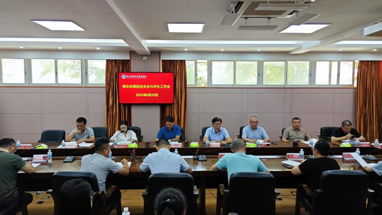 6月25日上午,我校在行政楼206会议室召开期末综治安全工作与学生工作会议。党委副书记陈金通、副校长花文苍出席会议并讲话,宣传部、教务处、学生工作处、后勤管理处、招生就业处、保卫处、团委、网络信息中心、各二级学院(学生)负责人、学生科科长参加会议。