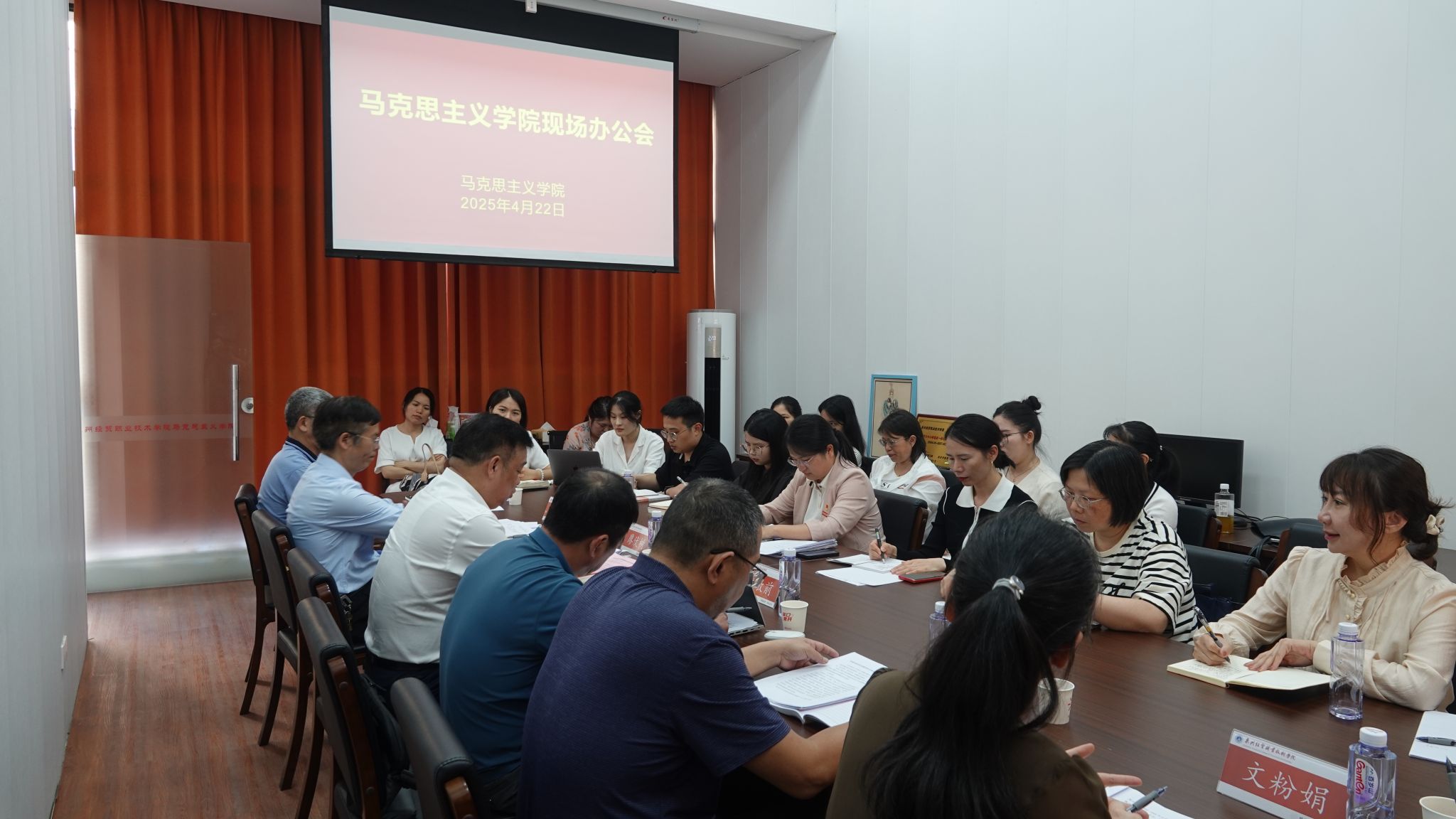 4月22日下午,校党委书记廖伏树,党委副书记、校长黄敬前,党委委员、副校长花文苍、张庆武,以及人事处负责人深入马克思主义学院调研,并召开现场办公会,马克思主义学院全体教师参加。会议由张庆武主持。