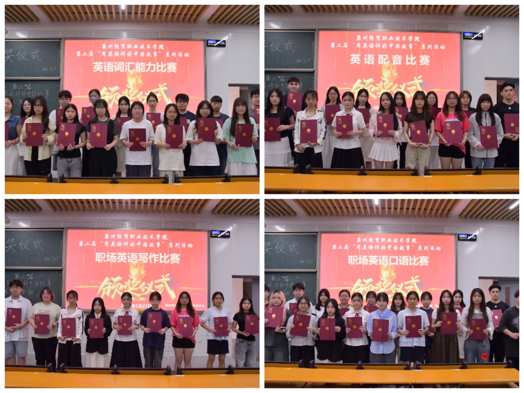 参赛学生们各展所长,在四大舞台上展开精彩角逐。最终英语词汇能力比赛30人获奖,英语配音比赛7个团队作品及3个个人作品获奖,职场英语写作比赛12人获奖,职场英语口语比赛18人获奖。
