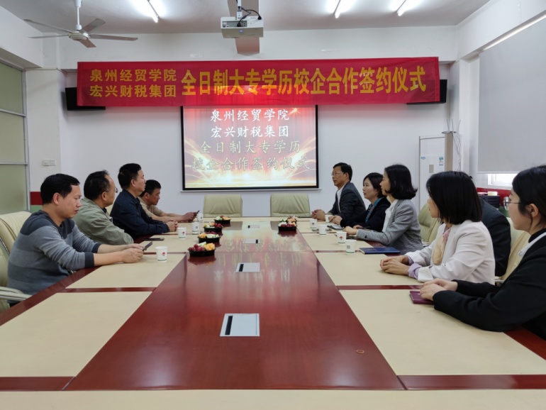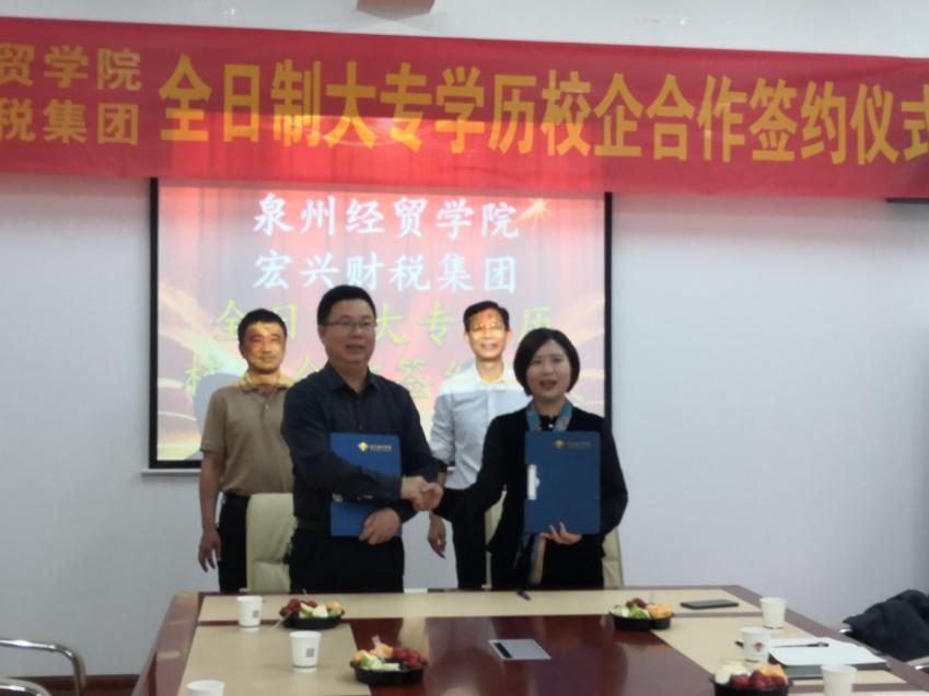 3月18日,我院与泉州宏兴财税集团“二元制”校企联合办学签约仪式在泉州宏兴财税集团三楼会议室举行。学院院长黄敬前,宏兴财税集团董事长庄惠忠,会审系主任沈永希,宏兴会计教育校长邓丽华,会审系副主任汪建家,学院教务处实训科科长柯杰东以及宏兴财税集团部分管理层人员出席签约仪式,仪式由邓校长主持。